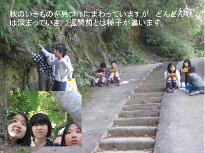 10月下旬にはまだ秋の生きものがずいぶんいたのですが,11月中旬の今になるとクモが目立ち,他の虫はあまり見かけません。4年生の子たちは少し遅い秋見つけに校庭を探し回りました。