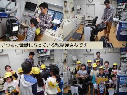散髪屋さんはそろばん塾の隣りにあります。子どもたちもお世話になっています。散髪屋さんでは専門の道具を見せてもらい,仕事の様子を親切に話してもらいました。