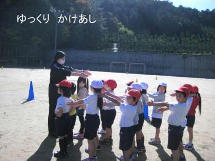 1年生もゆっくりかけあしで,はじめにグループ別に同じペースで走る練習をしていました。