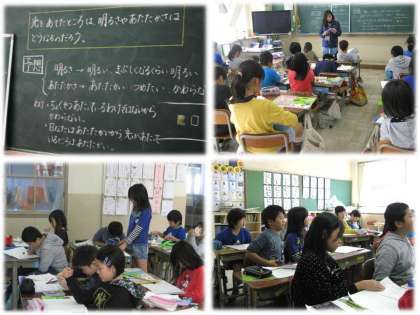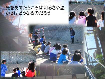 3年生は,太陽の光について調べていました。太陽の光がどのように進むのか,鏡で太陽の光を受け止めると,鏡面の部分だけが反射されます。反射した光を鏡を操作して,地面を這わすと,光の道ができました。まっすぐ伸びていきます。
