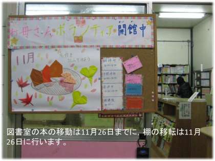 図書主任から,来週26日に,図書の本と本棚の移動をするという予定が出されました。図書ボランティアのお母さん方にも,都合がつくときにお手伝いに来ていただいてその準備にあたってもらっています。ありがとうございます。