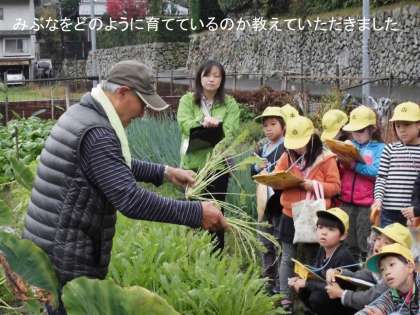 そこではみぶな サニーレタス 里芋 ネギなどが育てられていて,京都の野菜みぶなを手に取って育て方を教えていただきました。
