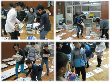 今日の5時間目に,5年生の児童が先生の指示を受けて,図書室から情報センター(会議室)へ移動する図書の本を運びました。何度も階段を往復し,運び込みました。汗を流しているのに,休みもせずに運びました。