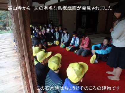 5・6年生は栂ノ尾高山寺にも足を運びました。高山寺には今から800年以上前に描かれたといわれる鳥獣戯画がこのお寺の蔵から発見されました。そのころ,このお寺で修業されていた僧が描かれたのではないかと言われています。栂ノ尾から見える景色は800年たっても変わっていないと思います。石水院から見える景色を味わいました。