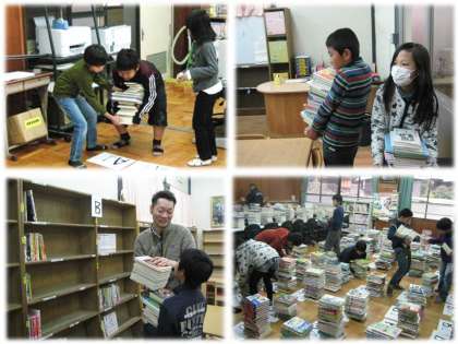 午後から4年生が,急ピッチで図書の本だし作業をしました。男の子も女の子も本を胸に積み上げ,すごい張り切りようです。あまり積みすぎて,「先生,ちょっと5冊ほどおろしてください」と,帰ってくる子もいました。