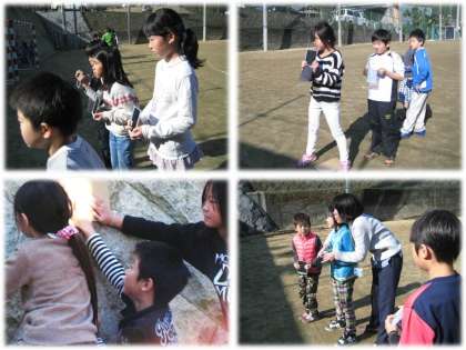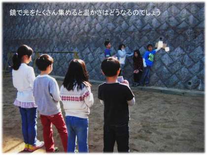先週,同じ実験を同じ場所ですると,寒さで子どもたちの鏡を持つ手が震え,焦点が合わなかったそうです。今日も寒いですが暖かい服装で実験に臨みました。それでも微妙に身体が震えるのか,グループで協力して太陽の光を集めるのに苦労していました。