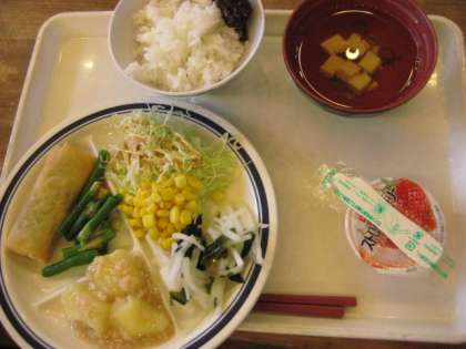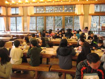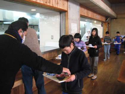 1日目の夕食はバイキングです。そり遊びでおなかもすいて,好きなおかずをお皿いっぱいに盛り付けしていただきました。