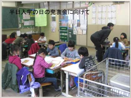 来年度1年生として入学してくる子たちに,「学校ってこんなところだよ」と説明するために,先生が用意した言葉をもとにグループごとに自分たちで練習したり,説明の絵を描いたりしていました。