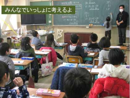 1年生は午前中,担任の先生のかわりに教務の先生に来てもらい算数の学習をしました。文章問題を読んで足したらよいのか,引いたらよいのか,先生は,ことばの意味からイメージして「たし算」か「ひき算」か導き出していました。