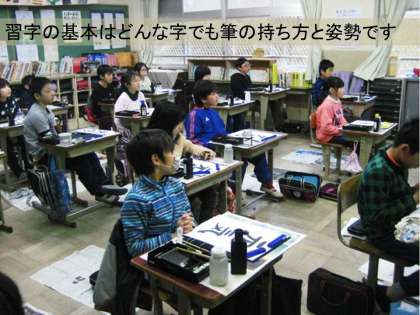 習字はどんな簡単な文字もどんな難しい文字も,筆の持ち方と姿勢が基本になります。担任の先生は,一人一人回って,筆の持ち方を点検していました。
