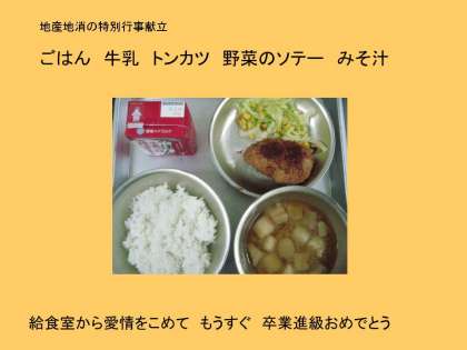 毎年,年に一度,卒業が近づくころ,また,進級が近づくころに,「卒業祝い」のトンカツが給食に出てきます。学校の給食でトンカツが出てくるのは調理は大変ですが,祝ってくれているという思いが子どもたちにはうれしい給食ですね。