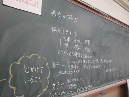 5年生では『男女の協力』をテーマに,クラスのみんなが仲良くするために,いつも心がけていることを教え合いました。異性を意識してしまうのは,こころが成長している証拠。恥ずかしいからといって協力できないのは,もったいないですね。