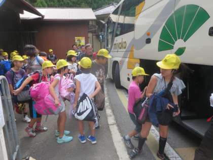4年生と5年生が,国立若狭湾青少年自然の家に全員そろって出発しました。今日から3泊4日の長期宿泊学習です。みんなで,出発式をおこない,バスに乗って出発しました。