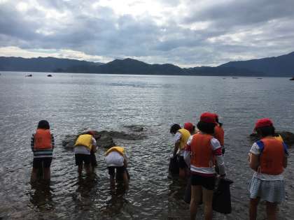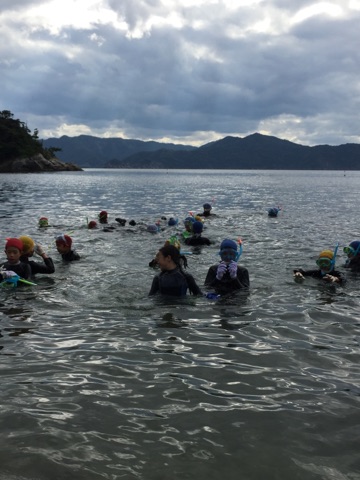 初日の活動が始まりました。ライフジャケットやウェットスーツを身に付けて,海の生き物の観察をしています。なかなか見られない生き物を発見し,歓声を上げている子ども達も見られました。やっぱり美しい海での活動はいいですね。