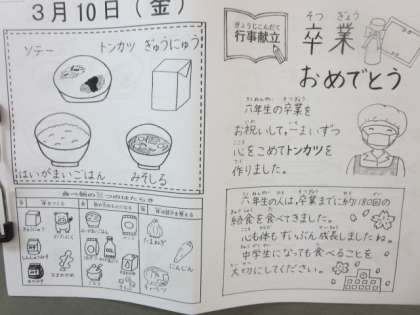 今日の給食は,卒業をお祝いする献立で,ごちそうでした。6年生は,卒業するまでに,1180回給食を食べているそうです。色々な思い出を残していることでしょうね。