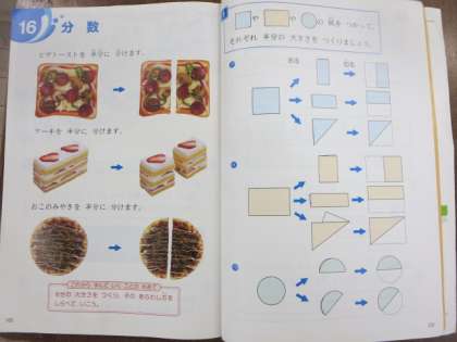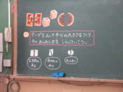 2年生は分数の学習に取り組んでいました。何気なく「半分」といいますが,半分にはいろいろな大きさがあります。それをテープや折り紙を使って体感していました。