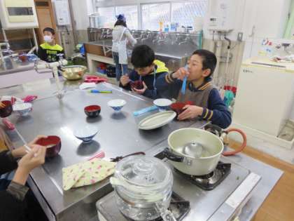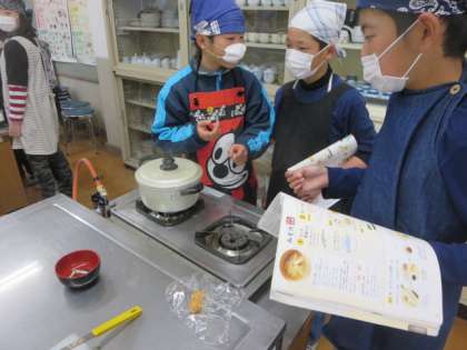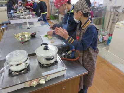 5年生がご飯とみそ汁の調理実習をしていました。ご飯をうまくたくにはどうしたらいいかな。大根を軟らかく煮るにはどうしたらいいかな。みそをとくにはどうしたらいいかな。いろいろ考えながらおいしいご飯とみそ汁を作っていました。