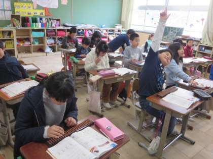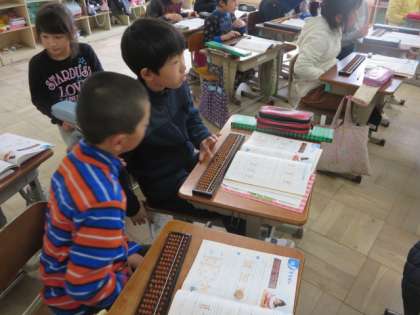 コンピュータの時代になりましたが,やはり,そろばんの学習も行っています。自分のそろばんをうまく操作して計算していました。