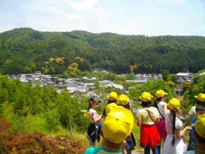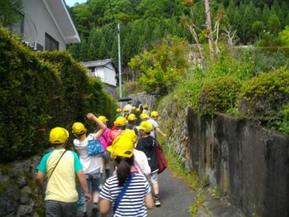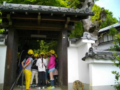 「高雄小学校の校区にはどんなとくちょうがあるのだろう。」と担任の先生が問いかけ,方位磁針を片手に校区を歩いていきました。今日は,国道から中に入り,坂をのぼってお寺を見てきました。途中で出会った方から「このあたりには20ほどのお寺があるのですよ。」と教えていただき,子どもたちと驚いていました。お寺の高台からは,町並みを見下ろすことができ,自分の家を見つけたり,校区がどんな様子なのかを調べることができました。次の校区たんけんもあるそうです。どんなところに行くのか楽しみですね。