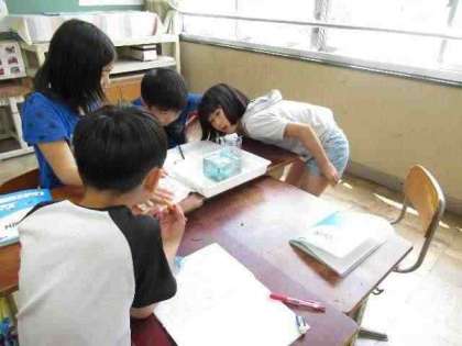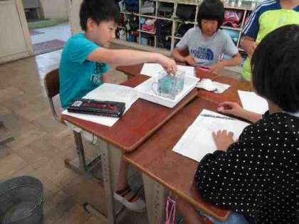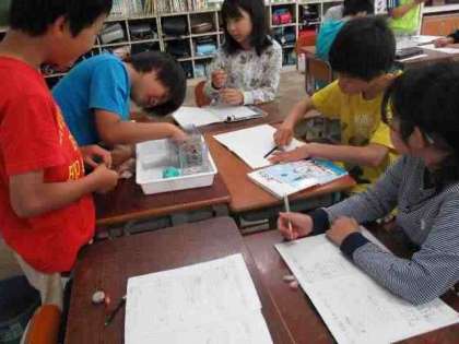 今日は,粘土のような形が整っていないものでも,水の中に沈めて,増えた「かさ」の分を体積に置き換えることで,粘土の体積が求められることを実際にやってみました。「1目盛り分のかさが増えたのは1dL分だから,粘土の体積は100㎤になるね。」と,確かめながら調べていました。単位を置き換えるのは難しかったのですが,粘土の体積でも調べることができるとわかって嬉しかった様子でした。