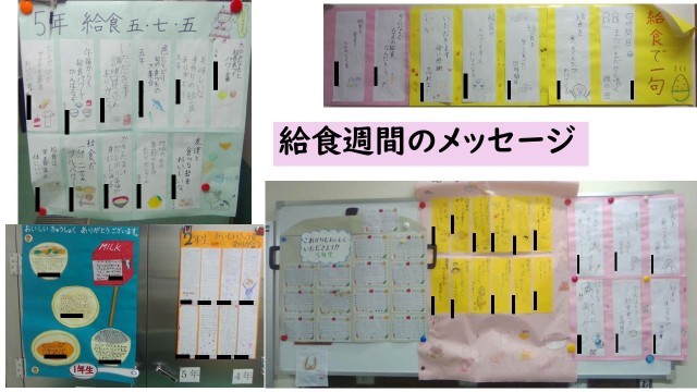 給食感謝週間に各クラスで作成したメッセージを給食室に掲示していました。給食当番をするときに「もっと見たい。」と通り過ぎていく子たちもいました。