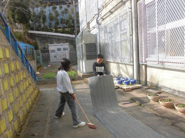 今日の縦割り掃除の時間には、6年生を中心に砂だらけのシートをよけて砂を集めたり、シートについた泥をはたいて落とす一生懸命な子どもたちの姿がありました。「頑張っているね」「ありがとう」と声をかけたくなる素敵な姿でした。