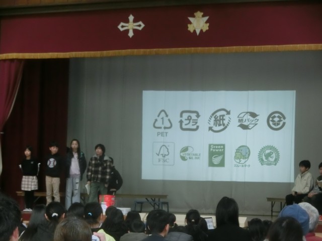 4年「2050年 高雄の未来は○○いっぱい」の発表です。4年生は、総合的な学習で取り組んできたエコライフチャレンジの学習や、清滝川での生き物調べの活動をまとめ、発表を行いました。発表では、自分たちが調べたエコな暮らし方の方法や、川の生き物などについて劇やクイズを交えて紹介しました。学びをしっかりと自分事として感じている様子が伝わってきました。