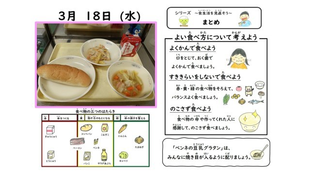3月18日(水)の献立は「コッペパン・ペンネの豆乳グラタン・野菜のスープ煮」でした。