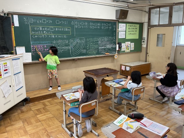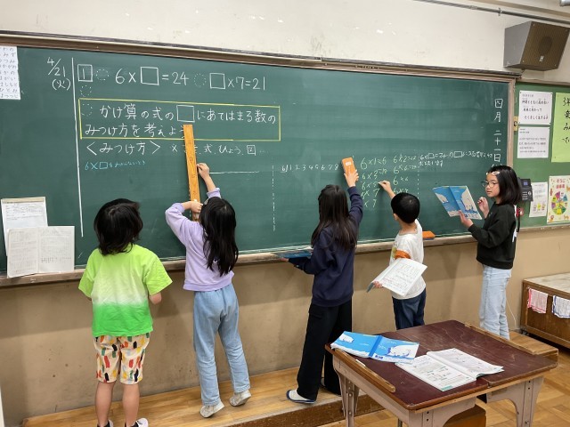 この日は「6×□=24」「□×7=21」の□に入る数字の求め方を考えました。一人学びの後にペア(または3人)で交流し、全体の前で考え方を説明しました。3年生になって初めての発表形式でしたが、たくさんの人が手を挙げるなど、意欲的に取り組む姿が見られました。