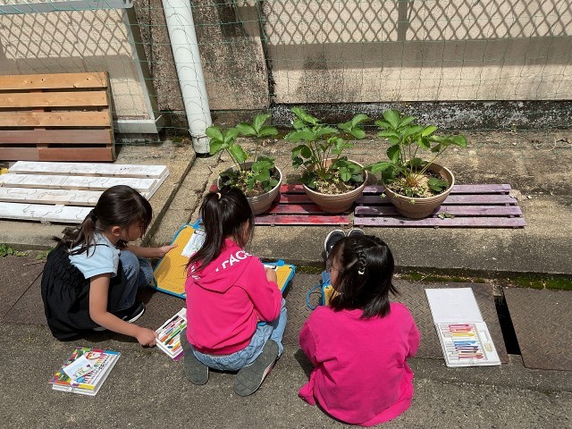 2年生の図画工作科「きせつをかんじて」の学習で、探検バッグを持って校内を探検し、春探しをしました。花や若葉、鳥など、春らしい植物や生き物を見つけ、よく観察してスケッチしました。「色がきれい」「鳥の足はこうなっているんだ」など、気づいたことを楽しそうに話しながら、形や色を工夫して描く姿が見られました。子どもたちは、身近な自然に目を向ける楽しさや、描くことの喜びを感じることができたようです。