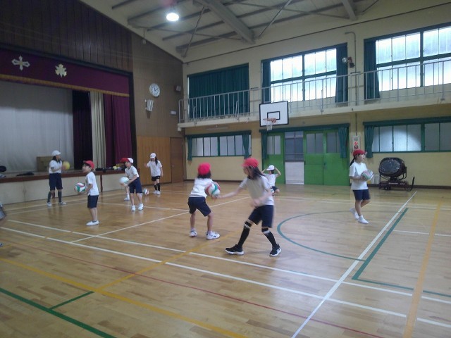 今日は最後の体ほぐしの運動でした。ストレッチをした後、線鬼をしました。後半は、ボールを使った体ほぐしの運動を行いました。最後に2つのチームに分かれて、ボール送り競争をしました。「上・下」など声をかける様子が見られ、声をかけていたチームが勝利しました。