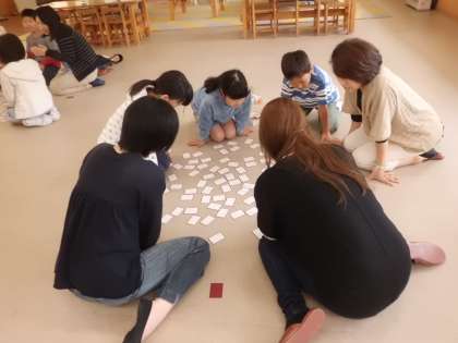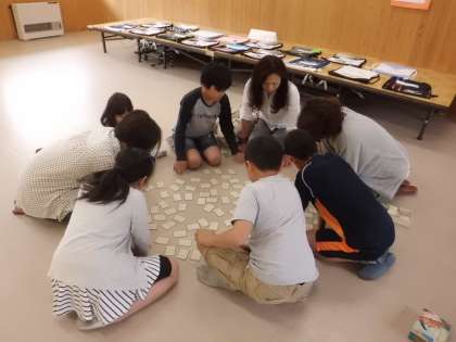休日参観の親子活動では,子どもVS大人の百人一首大会を行いました。