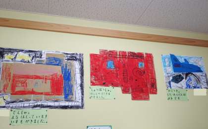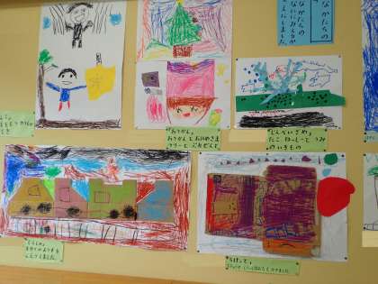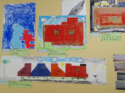 6月7日(水)いろいろな形が何に見えるか考え,絵に表しました。背景を工夫したり,それに関連するものを描いたり想像力を働かせ,生き生きと表現してました。教室の壁面が,とてもにぎやかになりました。