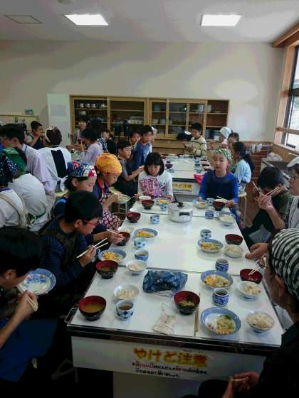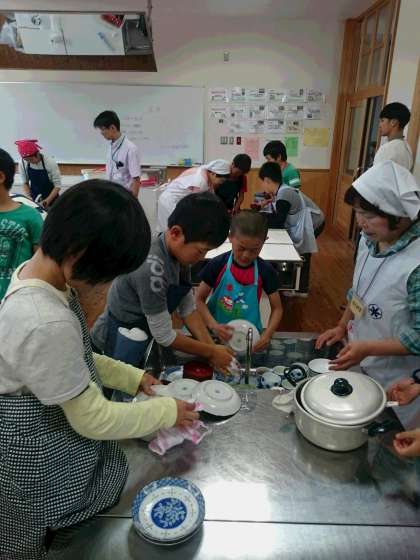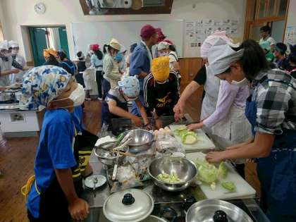 あうる京北から第一小学校に移動して、健康しゃくなげのみなさんの指導で、京北の食材を使った調理実習をしました。
