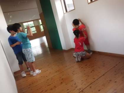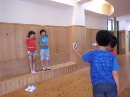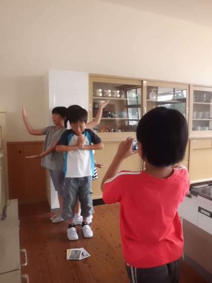 図画工作の時間に,有名な作品のカードを見ながら体で表現し写真を撮りました。