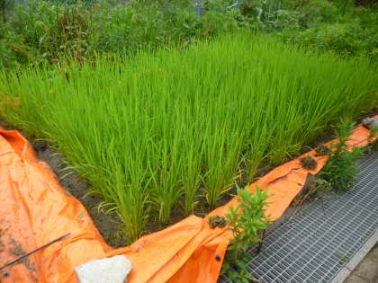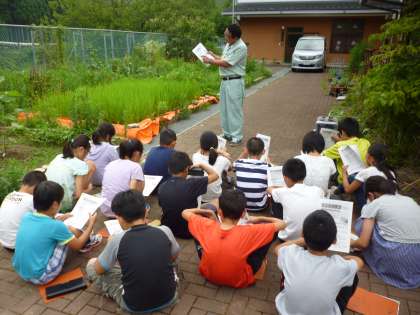今回は,JAさんから講師に来ていただき,「中ぼし」の具合を見ていただきました。夏休みにこれから入る子どもたちは,稲の管理のことをしっかりと聞いていました。また,8月中頃に入って,稲の花が咲くと聞いて,子どもたちは驚いていました。