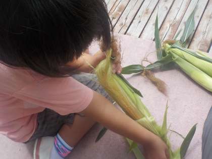 畑の野菜がどんどん育って大きな実をつけています。トウモロコシは,皮をむくときれいな種がびっしりとついているのが見えて,とても嬉しくなりました。収穫した野菜を使って来週,収穫祭をする予定です。