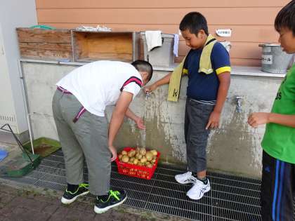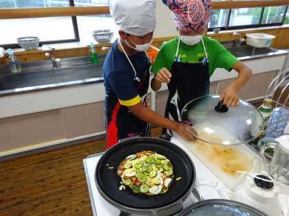 夕食の献立はカレーライス,ポテトサラダ,ピザです。学級花壇で育てた新鮮なジャガイモとズッキーニ・バジルを使って調理します。どの班もおいしく作ることができました。