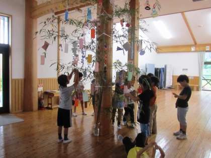 それぞれの願い事を書き,裏には思い思いの絵を描いて,笹に飾りました。