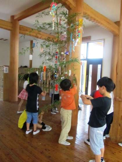 木の短冊を持つと,子どもたちは「木のいいにおいがする」「何の木かな?」と言いながら,紙の短冊との違いにわくわくしている様子でした。