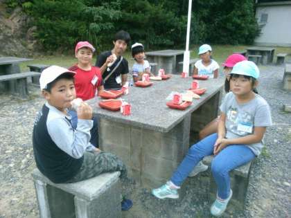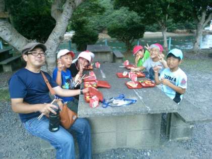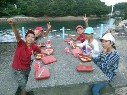 今日の朝食は、昨日野外炊事をした野外炊事場で、とんびに気をつけながら、楽しくいただきました。すぐそばを流れる深谷水道を通る漁船の方に手を振っていただきました。