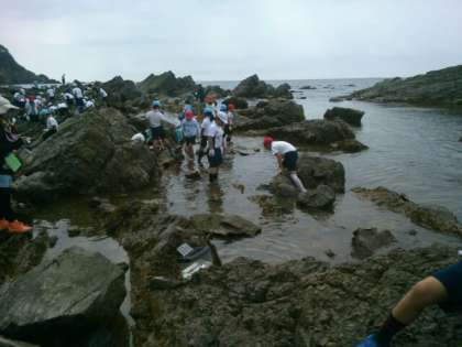 2日目、午前の活動は、磯観察です。みさきの家のすぐ前にある、宮崎浜で、海の生き物探しです。貝を見つけたよ!なまこを捕まえた!たこ発見!子どもの歓声があちこちから聞こえてきます。また、