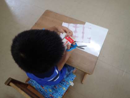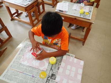 9月6日(水)アサガオで染めた和紙を使い,小物入れを作りました。牛乳パックの周りを糊ではる作業は,少し難しそうでしたが,楽しんで活動していました。