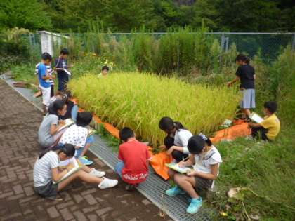 いよいよ収穫の時期となりました。こつこつと草抜きや水の管理,そして毎日の観察を続けた結果,稲穂はすくすく大きく育ちました。子どもたちはとてもうれしそうです。