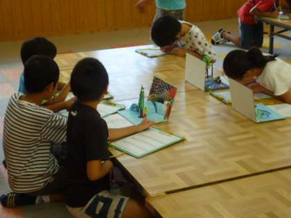 図画工作科では「ミラクルミラーステージ」(立体作品)の鑑賞会を行いました。ミラーを利用して,奥行きを出したり,向かい合って試合をしている表現をだしたりと,どの作品も工夫がとても見られました。子どもたちは友だちの作品をめあてをもって鑑賞していました。