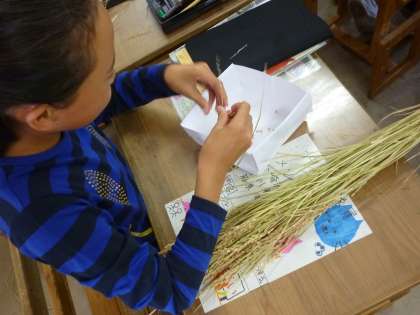 米の収穫が終わり,これから脱穀の作業に入ります。昔はすべてこのように手作業だったことから,子どもたちは,昔の人々の大変さを感じているようです。大切に育てたお米。一人一人,気持ちをこめて丁寧に作業していました。