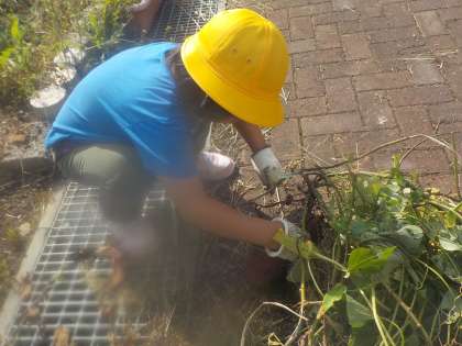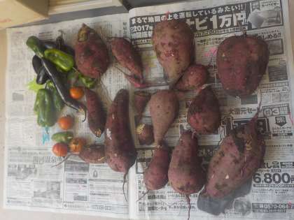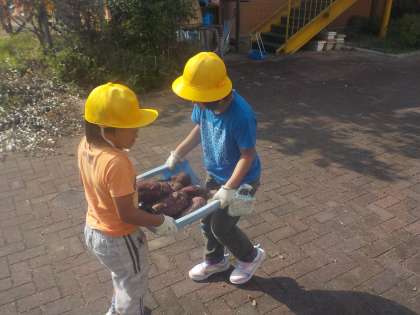 生活単元学習で育てているサツマイモの収穫をしました。つるがたくさん伸びて葉っぱもたくさん出ていましたが,根っこはどうなっているのかなあと思いながら茎を力いっぱい引っ張りました。自分たちの顔くらいあるものもあり,大喜びで収穫しました。