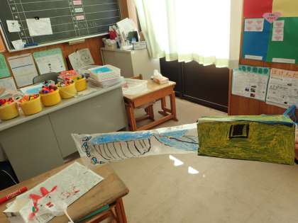 図工では,牛乳パックに入れた長いビニル袋にストローで息を吹きこみ,中から何かがとびだすというしかけの物を作っています。意欲的に絵を描いたり,色画用紙をはったりし楽しんで活動しています。