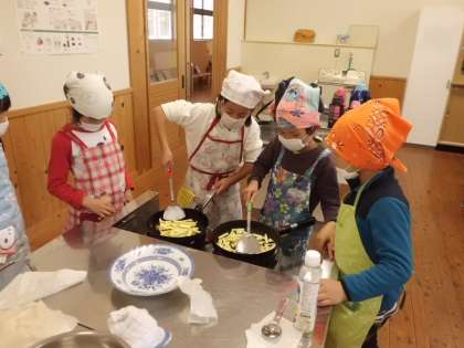 それぞれの学校で掘ったサツマイモを持ちより,各グループで事前に相談して決めたサツマイモスティックと,サツマイモの茶きん絞りを作りました。