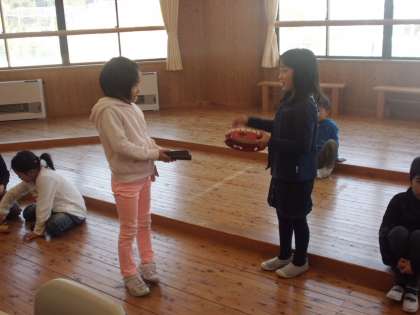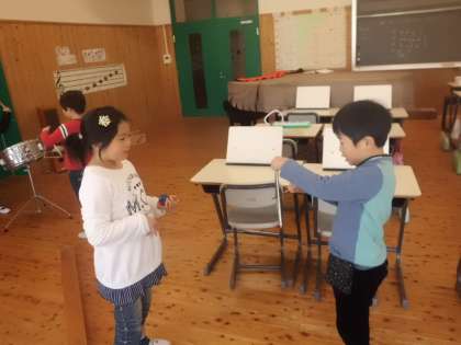 友だちとペアで楽器を鳴らし,呼び掛ける役,答える役になりました。